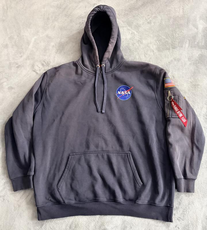 Легендарний худі Alpha Industries з космічною символікою NASA. Особливості: • Матеріал: бавовна • Колір: сірий (вигорілий) • Бренд: Alpha Industries • Логотип NASA на грудях • Принт Space Shuttle Mission на спині • Прапор США на рукаві • Кишеня-кенгуру • Капюшон з регулюванням Стан: задовільний • Колір природно вигорів від часу • Принт на спині частково розсипався • Пляма фарби знизу • Загальна структура збережена Виглядає по своєму цікаво, розмір 4XL надаю заміри: Плечі 58 см. Загальна довжина рукава 64 см. Напівобхват грудей 74 см. Загальна довжина по спині 76 см. Автентичний предмет від культового американського бренду військового одягу.