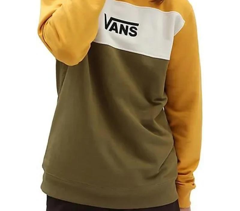 ФИРМОВЫЕ РЕЧИ ПО НИЗКОЮ ЦИНЕЙ Мужская толстовка (свитшот) от бренда Vans, модель которой называется Retro Active Crew. Характеристики и особенности: ДИЗАЙН:модель выполнена в стиле color block (цветные блоки). Она сочетает три основных цвета: горчично-желтый на плечах и рукавах, белую горизонтальную полосу на груди и темно-оливковый (зеленый) низ. БРЕНДИНГ: По центру белой полосы расположен классический черный логотип Vans. МАТЕРИАЛ: Основная часть изделия изготавливается из хлопка. ПОДРОБИКЫ: Классический круглый вырез горловины, эластичные манжеты и подол.