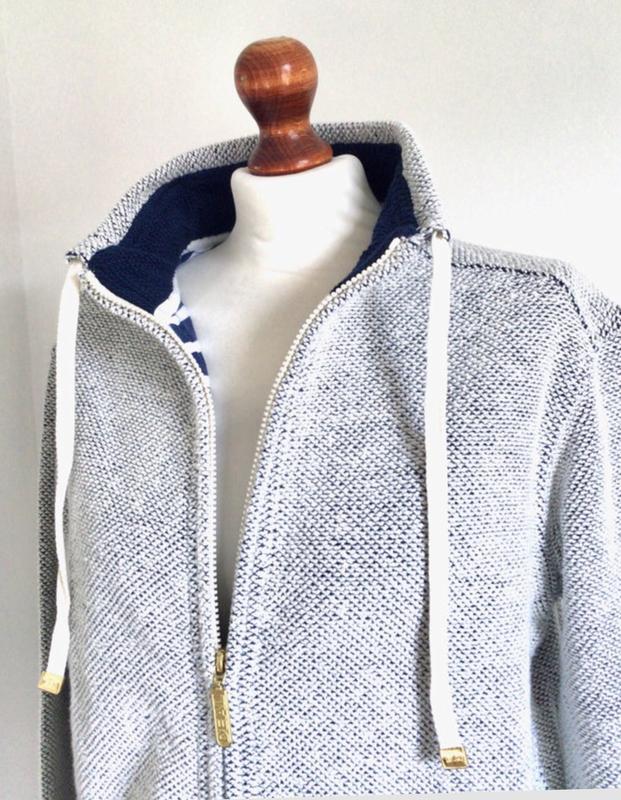 Хлопковый трикотаж , верх вязан сотами, смотрится красиво и уютно. Цвет натуральный мергель комбинирован с ультрамарином. Вещь мягкая, теплая, комфортная, с большими внутренними карманами и огромными боковыми. Молния пластик с металлическим ползунком, скользит мягко. Британский бренд. Длина рукава 77,5 см, плечо 19, длина по спине 76, объём 64-65, ширина спины 46-47 см.