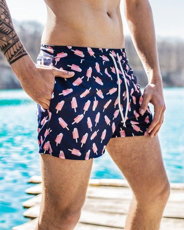 Пляжні шорти Pool day Morozhenoye, зовнішній матеріал виробу - легка європейська плащівка, також є сітка-підкладка. Фіксується за допомогою резинки і шнура. У виробі 2 бічних і одна задня кишеня на подвійний липучці. Над задньою кишенею декоративна фірмова жакардова нашивка.