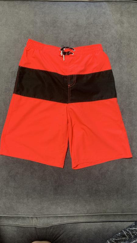 Яскраві малинові з чорною вставкою шорти на зріст 164 см На широкій резинці. Труси- сітка. Накладна кишеня позаду, на липучці. Ширина по поясу 35 см, довжина 52 см Стан ідеальний, через яскравий колір, син майже не носив)