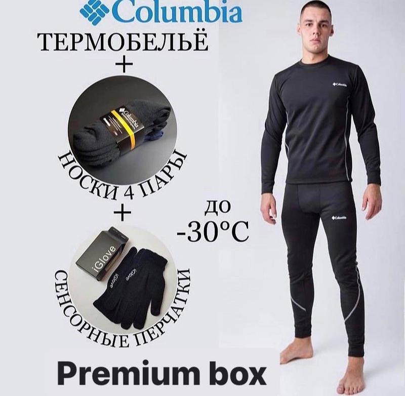 Premium Box В комплект входит: ✔️Термобелье 1 шт ✔️Термоноски 4 пары ✔️Сенсорные перчатки 1 шт ✔️Подарочная коробка ☑️ Размер: S,M, L, XL, XXL ☑️ Материал: 95% полиэстер, 5% эластан ☑️ Цвет: Чёрный