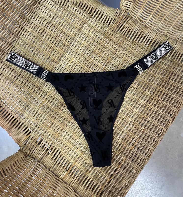 Victoria's Secret. Модель создана для уверенных в себе девушек, которые не боятся ярких красок и любят экспериментировать. Стринги на низкой посадке с высоким вырезом на бедрах. Выполнены из легкой сетки с фактурными велюровыми узорами. Стразы плотно приклеены. Материал не портится после стирки (рекомендуем использовать исключительно ручной режим стирки). Сохраняет внешний вид после длительного ношения. Ластовица из 100% коттона. Размеры: M (42), L (44), XL (46) Материалы: по фактуре полиэстер.