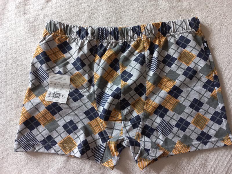 Трусы боксеры новые. Состав 95% хлопок, 5% эластан. Трикотаж упруго эластичный, не тонкий. Рисунок по лицевой стороне. Резинка скрытая под трикотажем. Качество трикотажа и пошив очень хорошие. Производство Польша. Размер указан Хл, реально немного маломерят. На размер Л, возможно Хл. Замеры: - высота - 29 см, - по верху резинки - 34,5 см, - бедра примерно - 45 см.