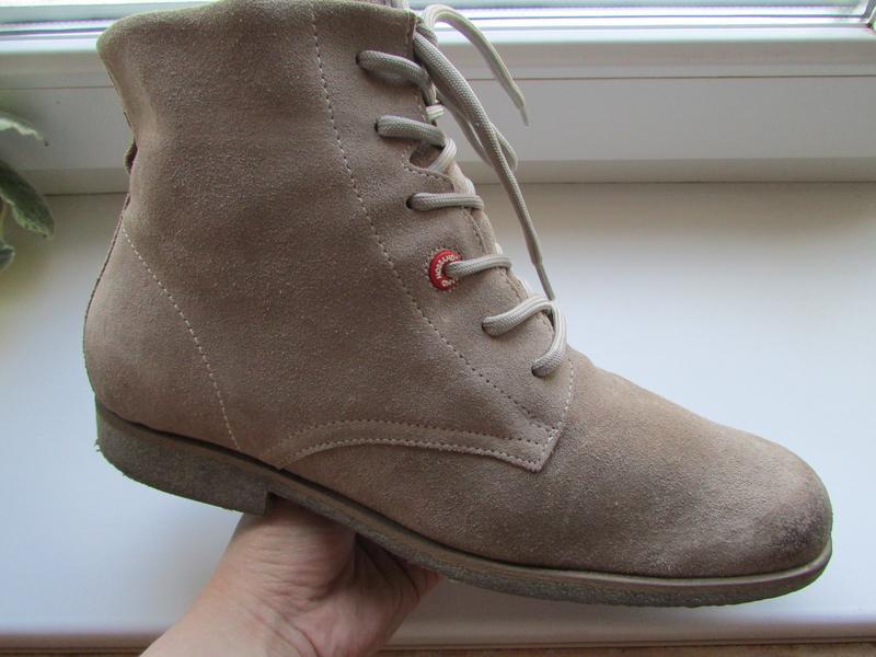 Черевики в дуже хорошому стані на стопу 27 см Довжина по устілці всередині 28 см Носочок звужений нога не дістає в носкову частину Вказаний на них 42 розмір Верх натуральний Всередині текстиль Дірок немає Шкарпетки не збиті Задники не стоптані Підошва не стерта Йдуть на середню ногу Ціна нових близько 100 Євро