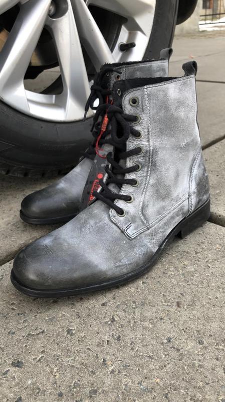 Ботинки мужские демисезонные. Производство Португалии. Изготовлены из натуральной кожи. Середина - натуральна ткань. Стелька кожаная. Ботинки черного цвета с интересным серым напылением, що придает им стиля. Модные и практиные. В военном стиле. Остался один 40 размер !!!