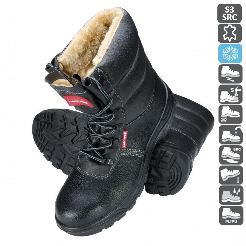 Матеріал: Шкіра Упаковка: Картонна коробка Підошва: Поліуретан Опис: Зимові чорні шкіряні черевики вище щиколотки з сірими і червоними елементами. Підкладка з м'якого хутряного трикотажу, який зігріє в холодну зиму. Міцні подвійні шви. Змінна устілка. Подвійна підошва з поліуретану, неслизька, непромокаємий; глибокий протектор для стійкості й додаткового захисту, параболічний каблук. Сталевий непробивний підносок.