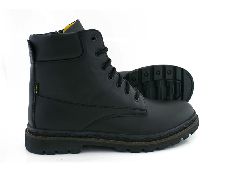 Комфортные мужские зимние ботинки украинского производства из гладкой матовой натуральной кожи. Обувь утеплена шерстью с внутренней змекой и на шнуровке, выполнены в чёрном цвете.