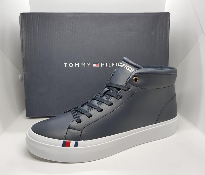 Кожаные теплые ботинки кеды Tommy Hilfiger оригинал Верх из натуральной кожи темно - синего цвета, подкладка из переработанного полиэстера, стелька из текстиля Подошва из вулканизированной резины и натурального каучука Логотип T.H на подошве и пятке Не на широкую ногу EU 42, по стельке 27, 5 ширина 9, 1