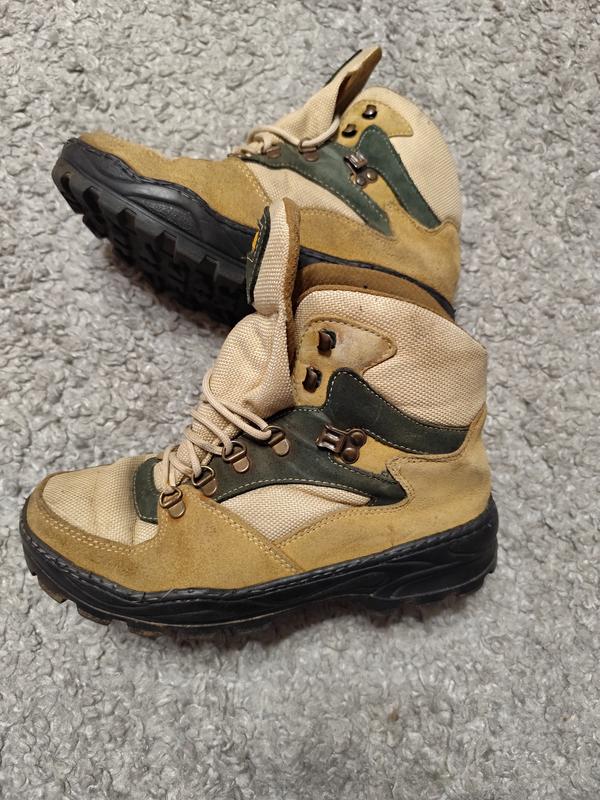 хорошее состояние,верх ткань, низ вставки кожаные.Подшитые полностью.Мицни,надежные и устойчивая протекторная подошва.Довжины по стулу, ширина регулируется шнурками.