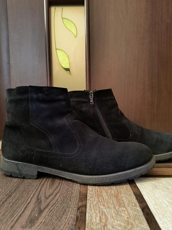 Мужские замшевые ботинки в очень хорошем состоянии. Теплые, в середине искусственный мех. Размер 44. Стелька 30 см. Присутствует сбоку работающая молния. В живую смотрятся лучше, чем на фото.