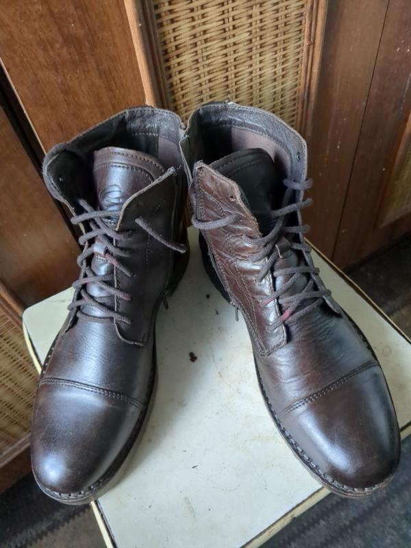 шкіряний верх кольору гнилої вишні, бордовий. шкіра товста та якісна. на язичку логотип бренда, збоку на заднику, на підошві та устілці назва бренда. носок прошитий, задник укріплений додатковою шкіряною накладкою. прошита поліуретанова підошва товста та міцна, на надійному протекторі. застібка на блискавці та шнурівці. класний колір, стильний фасон і відомий бренд гарантують якість виробу. розмір вказаний 7,5, довжина устілки 26,5 см.