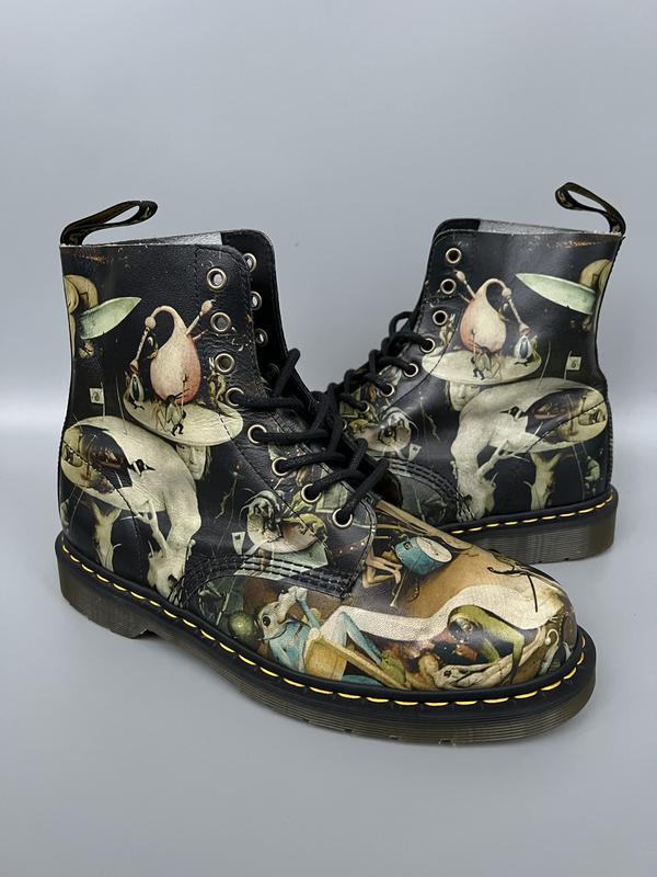 Оригінальні Dr. Marten's Рідкісні лімітовані музейні чоботи Bosch "Heaven" 1460 Pascal Матеріал Шкіра 44р.28см. Ідеальний Стан! Ці приголомшливі рідкісні чоботи у відмінному стані як нові взувались двічі. Випущені у 2014 році, попит на них значно перевищував пропозицію: «Ця мікроколекція, перша з нашої серії художників, заснована на картині «Сад земних насолод» голландського художника Ієроніма Босха. Чобіт Паскаля «Пекло» зображує світ вічного прокляття через спокусу та зло, тоді як черевики Паскаля «Небо» підкреслюють світло, любов та переваги вічного життя». «Pascal»: довговічність оригінальних, культових чобіт із 8 люверсами, прошитих Goodyear та виготовлених з Virginia, м’якої, дрібнозернистої шкіри Nappa. Виготовлено на культовій та зручній підошві Dr. Martens з повітряною амортизацією Створено для тривалого використання з міцним рантом Goodyear Використовуйте наш Чудо-бальзам, щоб підтримувати чистоту ваших чобіт, захищати шкіру Вірджинії та зберігати її м’якою та еластичною. Ці черевики Pascal Virginia розроблені для елегантного сучасного крою. Матеріал М'яка, дрібнозерниста шкіра, оброблена для гладкості та еластичності, наша Вірджинська шкіра зазвичай фарбується та пропонується в різноманітних яскравих кольорах