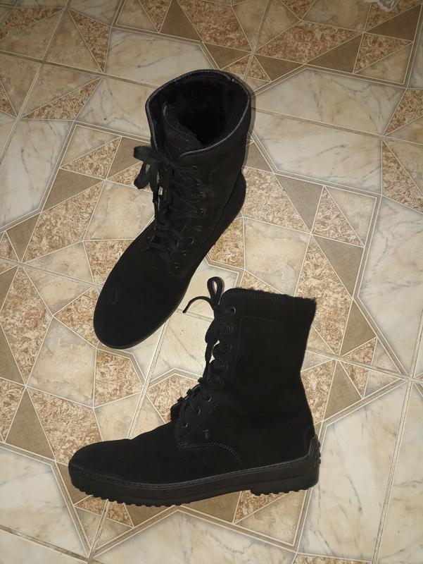 Мужские полусапоги, ботинки, берцы Tod's. Натуральная замша и натуральная овчина, Размер 9, стелька 27,5см, стопа до 27см ширина стельки 9см. Высота 23см, Подъем и ширина регулируются шнуровкой Зимние ботинки Gomino, символ городской элегантности, изготовленные в Италии, вошли в историю бренда благодаря своему сдержанному и пропорциональному дизайну. Эта версия, которая переосмысливает подошву оригинальной модели, сочетает наследие с современным шармом. Выполнены из телячьей кожи, эти ботильоны имеют люверсы для шнурков в стиле активного отдыха и выжатый монограмма Tod's. Мужские ботильоны сделаны в Италии, верх из телячьей кожи. Выжатый монограмму Tod's, кожаная подкладка и стелька. Культовая резиновая подошва Tod's, в целом состояние для использования идеальное (мех, верх, подошва), однако есть небольшое пятно на замше