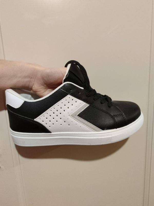 Черно-белые стильные мужские кроссовки из качественного кожзама. Имеют черные шнуровки, при желании можно использовать белые или другие цвета. 43 размер. Подойдут для спорта в помещении тренажерного зала: бег, теннис и другие виды спорта.