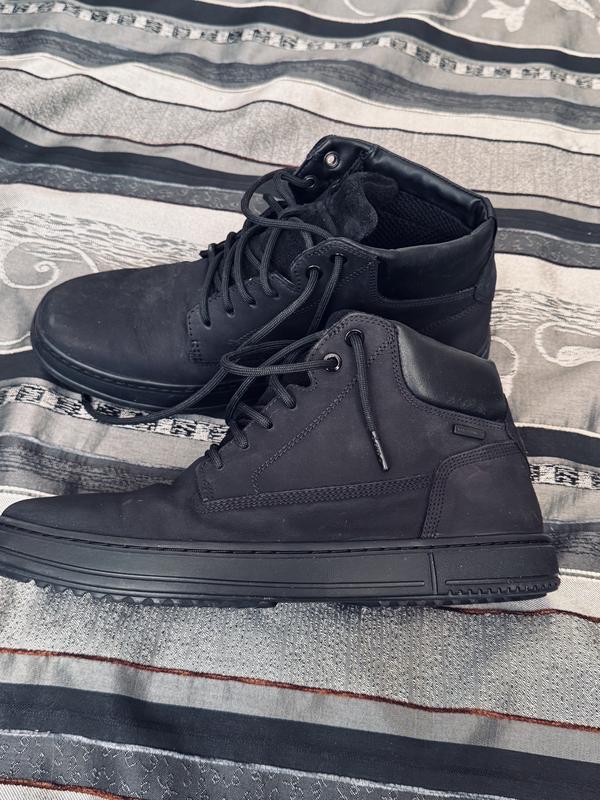 Чорні чоловічі черевики Geox з високоякісної натуральної шкіри з нубуковою поверхнею. Дуже зручні та дихаючі завдяки технології Geox, ідеально підходять для осені та весни. Класичний, універсальний дизайн для повсякденного використання. Деталі: • Бренд: Geox • Розмір: 40 • Колір: чорний • Матеріал: натуральна шкіра, нубукова верхня частина • Стан: дуже хороший / майже не носили