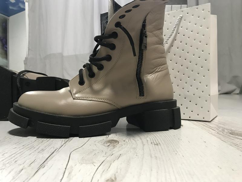 Шкіряні черевики бежевого кольору на товстій підошві. Розмір 39 на стопу 24,5-25 см . Нові без коробки, тільки примірялися , в мене нога 25,5, мені трохи тісно