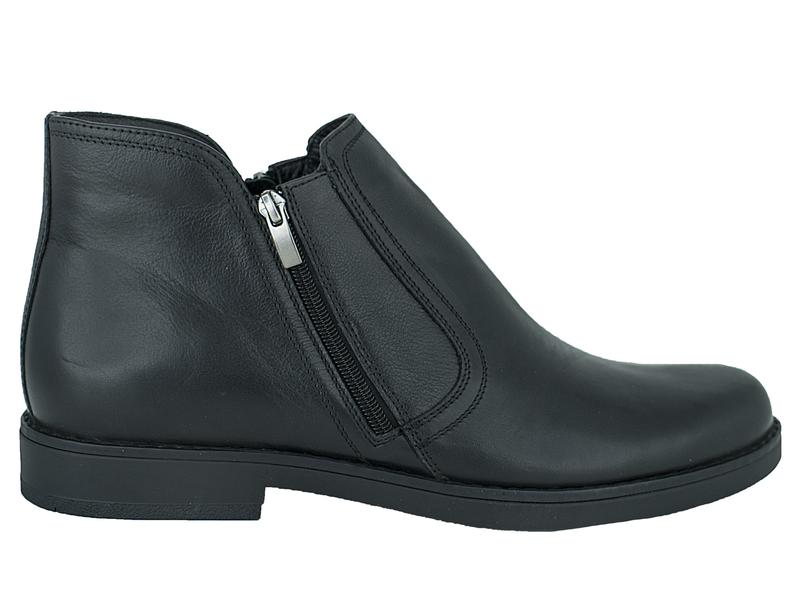 Классические зимние ботинки с повышенной полнотой украинского производства. Выполнены из натуральной кожи в чёрном цвете. Внутри утеплены шерстью, с обеих сторон есть змейки, подошва сделана из резины и не скользит. Украина, натуральная кожа, чёрный, зима, шерсть