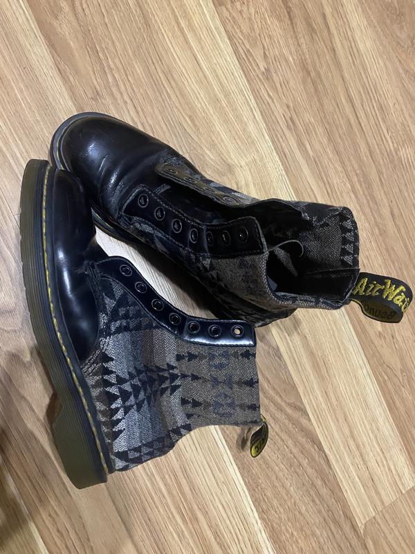 Черевики Dr. Martens оригінал Оригінальні черевики Dr. Martens з комбінованим верхом: натуральна шкіра + текстиль з принтом. Культова модель з фірмовою жовтою строчкою та масивною підошвою AirWair. Стильні, зручні та впізнавані. 🔹 Бренд: Dr. Martens 🔹 Розмір: не вказаний (орієнтуйтесь на заміри) 🔹 Довжина устілки: устілка відсутня, внутрішній замір ≈ 25,5 см, 40 розмір 🔹 Колір: чорний / темно-сірий з принтом 🔹 Стан: хороший ⚠️ Нюанси: є протертості тканини з боків біля п’яти (все видно на фото, враховано в ціні) шнурки відсутні Підійдуть на повсякденне носіння, альтернативний стиль, вінтажні образи.