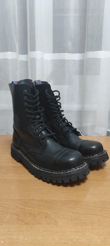 Продаю культовые высокие ботинки от бренда Steady’s. Настоящая классика для ценителей качественной обуви в стиле милитари, панк или металл. Купил в металл-шопе, вещь на 100% оригинальная. Стан: идеальный (обувал всего 3 раза для выступления на сцене). Ботинки еще даже не разношенные, выглядят как только из коробки. Материал: Натуральная толстая кожа высокого качества. Прослужат годы. Подошва: Массивная, тракторная, с фирменной прошивкой светлой нитью и металлическими винтами. Очень устойчивая. Детали: На язычке есть фирменная петля с флагом (Union Jack), на голени - тисненый логотип Steady’s. Защита: В носки вставлен металлический «стакан» (подносок). Это классика для такой обуви – носок не деформируется, держит форму и надежно защищает пальцы.