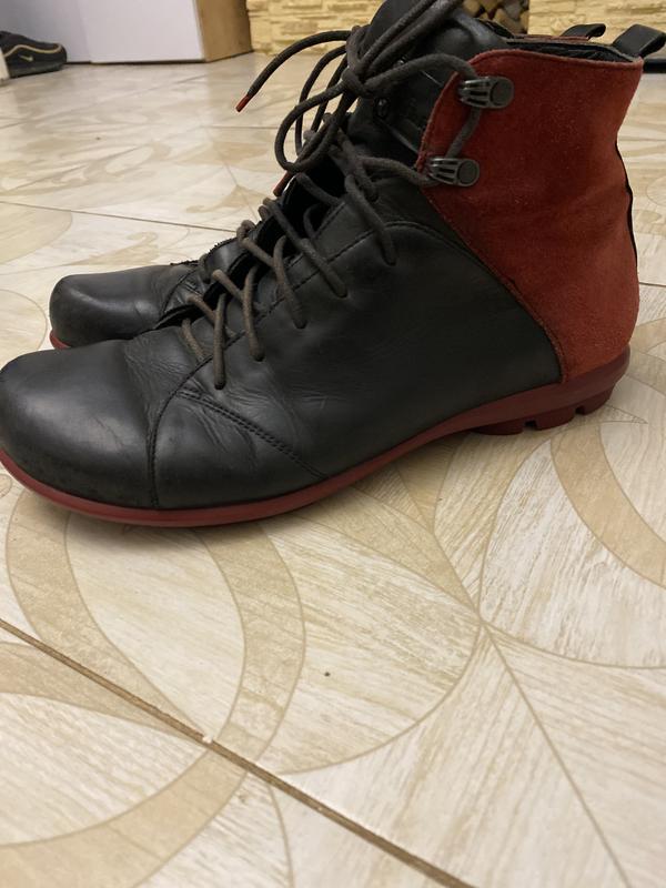 Think! Kong виготовлені зі спеціально обробленої шкіри, що робить їх стійкими до негоди – обов’язковий елемент осені та зими! Завдяки трьом шнурівкам та незвичайним деталям, що перекриваються, ці черевики ідеально поєднують стиль та практичність. М’яка шкіряна підкладка додає комфорту цим чудовим чоботам. Верх: Шкіра/Вощена замша Підкладка: Шкіра Підошва: латекс для чудової стійкості. В гарному стані