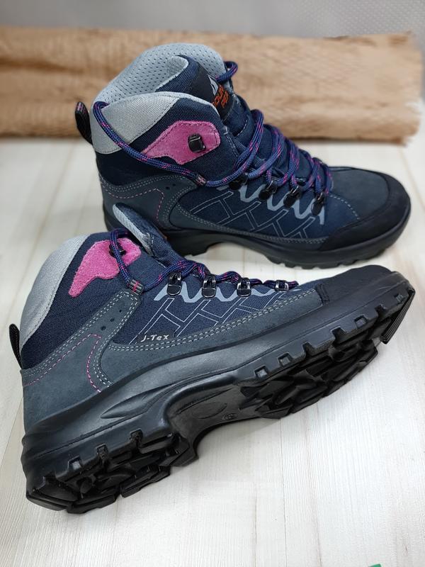 женские треккинговые ботинки в хорошем состоянии, размер 39. 25см Модель в темно-синем цвете с розовыми вставками, шнуровка выполнена с использованием прочных материалов. Верх обуви сделан из текстиля и кожи, подошва обладает высокой прочностью и сцеплением с поверхностью. Удобные и стильные ботинки подойдут для активного отдыха и повседневного использования. Производитель: J-Tex.