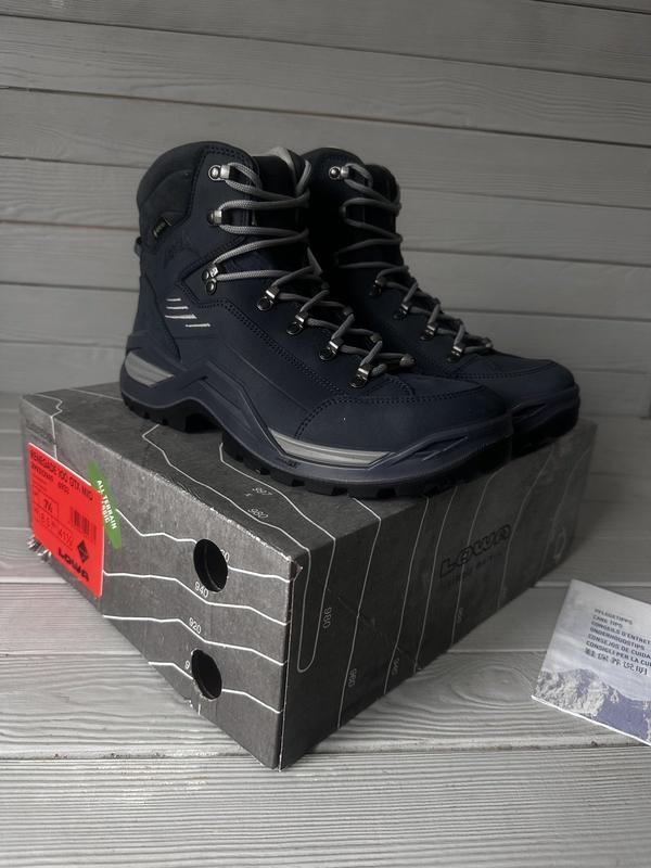 Черевики lowa renegade 100 gtx mid, оригінал Розмір 41-47 3800 Система Gore-Tex – захист від вологи та зберігання тепла ноги. – Знімна дихаюча тришарова устілка – клімат-контроль. – Проміжна підошва Lowa Monowrap – тривимірна конструкція між верхом і підошвою, яка забезпечує стабілізацію, бічний захист стопи, а також створює природну плантацію щиколотки від пальців до п’яти за допомогою технології Support Frame. – Амортизуюча проміжна підошва Lowa DynaPU +. – Підошва Vibram – зносостійка, довговічна, стійка до вологи та температурних перепадів, ідеальне зчеплення з різними поверхнями. – Колір синій. – Нові