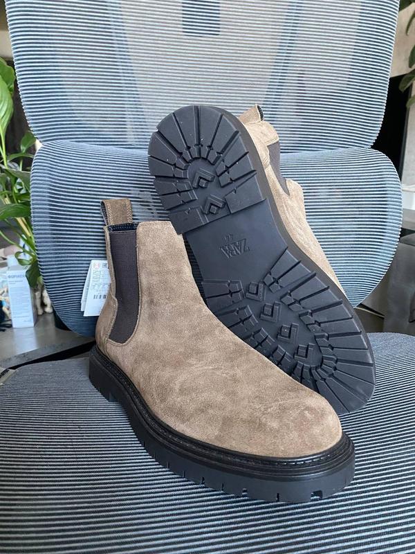 Ботинки-челси из кожаного замшевого спилка. Имеют эластичную вставку по бокам и петельку для облегчения обувания сзади. Круглий носок. Толстая тракторная подошва. Коричневато-серый | 2037/520/131