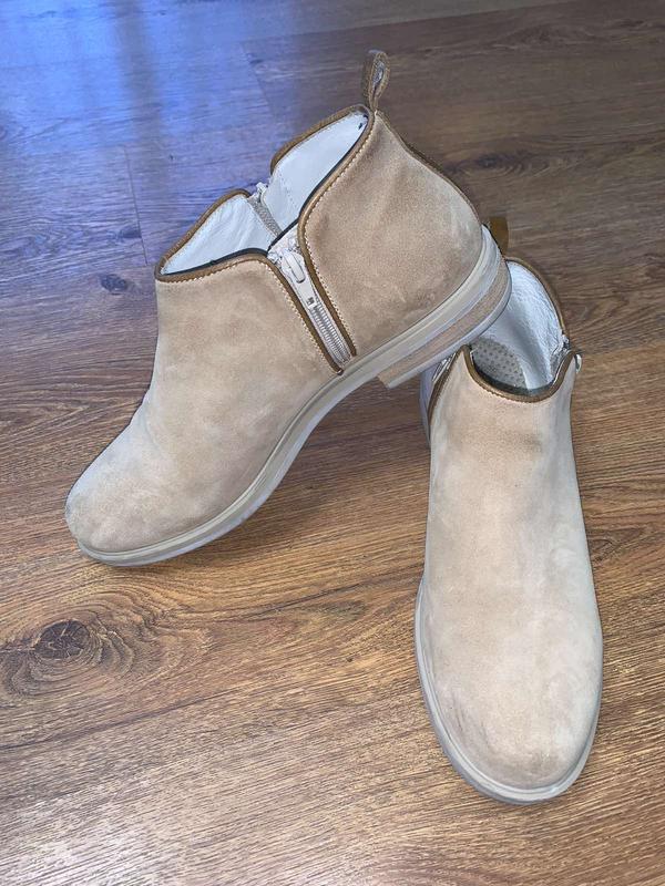 состояние идеальное натуральная кожа замш бежевого цвета застёгивается на 2 короткие молнии внутри кожаные плотные держат форму облягают ногу длина по стельке 27 см