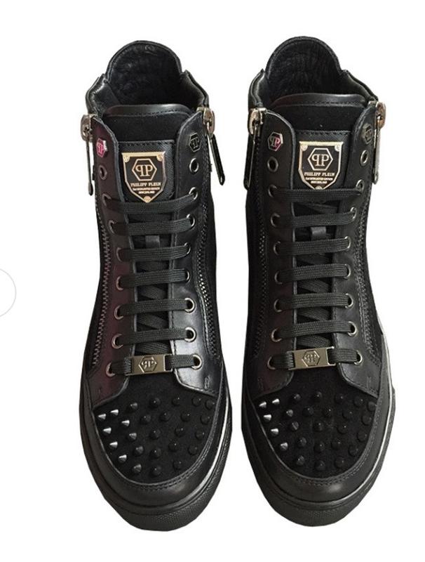 Мужские высокие кеды PP - отличная альтернатива ботинкам и другой межсезонной обуви. Замшевые вставки рядом с шипами и металлической брендовой деталью создают гармоничный тандем. Молния с двух сторон, обеспечит удобство при одевании. Выполнены из натуральной кожи Цвет: черный. Размер: 41, Материал: натуральная кожа и замша. Код товара 4632