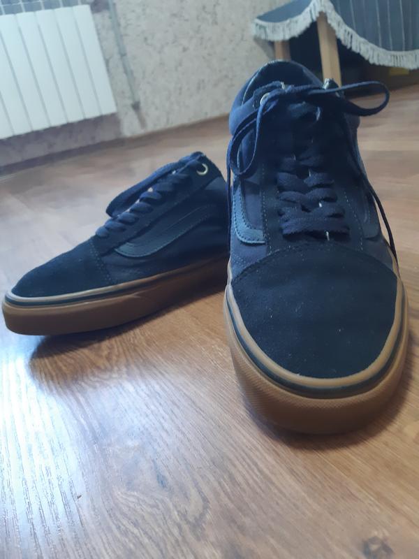 Характеристики: Модель: Vans Old Skool. Цвет: Синий верх с коричневой (резиновой) подошвой. Материал верха: Обычно это сочетание замши и текстиля (канвас). Дизайн: Низкий силуэт, характерная боковая полоса (Sidestripe), усиленные носки, мягкий воротник для поддержки и гибкости, а также фирменная вафельная резиновая подошва.