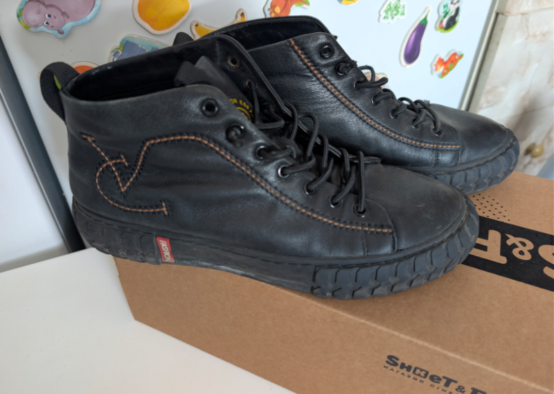 Продам стильні та зручні високі кеди/черевики чорного кольору. Виготовлені з натуральної шкіри. Мають цікавий дизайн з контрастною прошивкою (рудою/коричневою). Міцна, рельєфна підошва, ідеальні на осінь/весну, теплу зиму, всередині утеплені мікрофлісом, на довжина устілки 26.5-27 см.