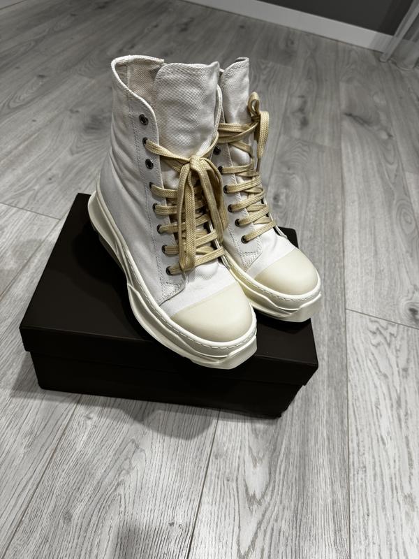 Високі кеди Rick Owens Abstract High у білому кольорі. Особливості: • Розмір: 42 • Колір: білий з золотистими шнурками • Високий силует з характерним дизайном Rick Owens • Текстильний верх з фірмовою етикеткою всередині • Товста підошва у стилі бренду • Застібка-блискавка збоку для зручності • Оригінальна упаковка Стан: Нові у наявності Ціна: 6650 грн Ідеально для створення авангардного образу у стилі Rick Owens.