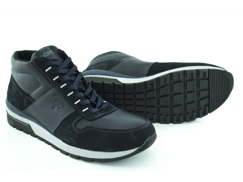 Тёплые мужские зимние кроссовки украинского бренда. Зимняя обувь выполнена из мягкой натуральной кожи, утепленные шерстью, модель на шнуровке с удобной высокой подошвой, в синем цвете с нубуковыми вставками.