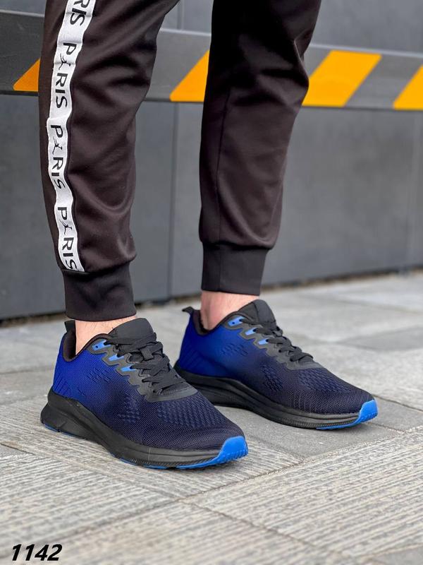 Код 1142 Мужские Кроссовки Материал обувной текстиль Цвет черный + синий Высота подошвы 4 см Высота обуви от пятки 7,5 см Легкие и удобные На шнуровке Размерная сетка 40 - 26,5 см 41 - 27,0 см 42 - 27,5 см 43 - 28,0 см 44 - 28,5 см 45 - 29,0 см