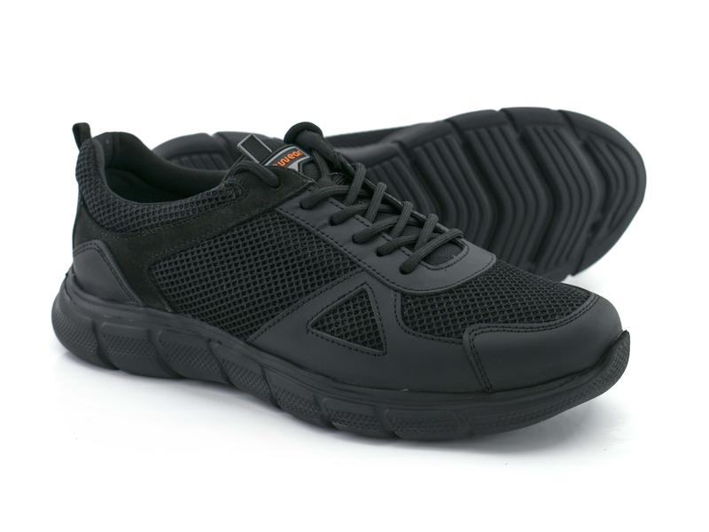 Комфортные летние мужские кроссовки из гладкой натуральной кожи со вставками из сеточки. В черном цвете.