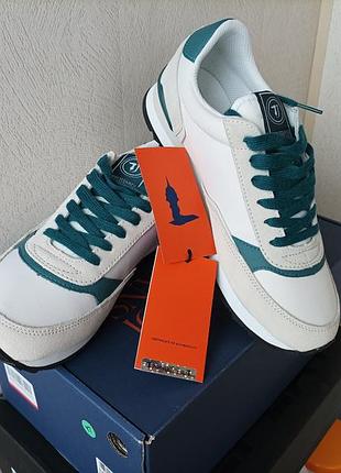 Оригінальні кросівки Trussardi Jeans з США. По суті унісекс. Розмір US 7 (наш 40, устілка 25 см). Етикетка із сертифікатом автентичності (є на фото) підтверджує оригінальність. Комбінований верх-замша та текстиль. Устілка незйомна. Досить традиційна форма кросівок. У комплекті, окрім зелених, ще й білі шнурки.