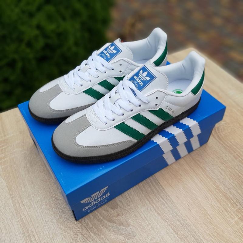 11019 ode артикул Adidas SAMBA Белые с зеленым производство Вьетнам, фирменные коробки Размеры 41-45 41й(26см), 42й(26,5см), 43й(27,5см), 44й(28см), 45й(28,5см) Верх кожа/замша, подошва резиновая Цена – 1880 грн.
