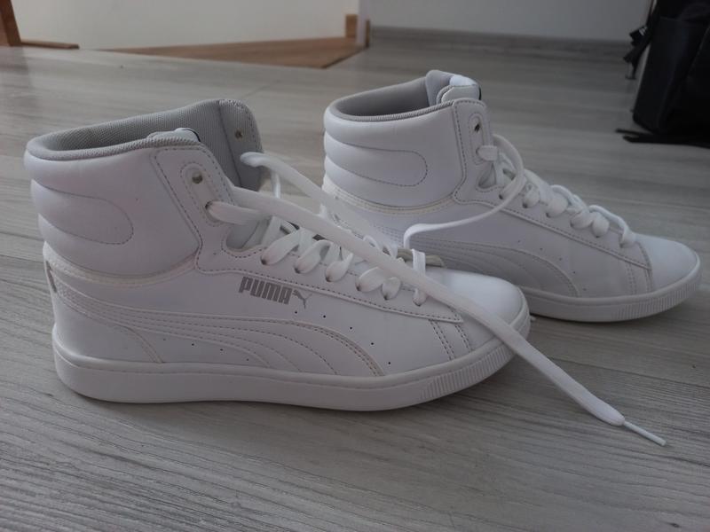 Кроссовки Puma оригинал белые, 38 размера, длина 24 см одевала 1 раз,одное маленькое пятно в середине,стан идеальное, очень мягкие и комфортные.