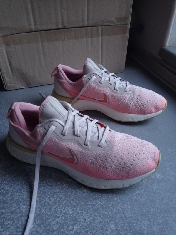 Кросівки Nike Odyssey React, оригінал, дуже гарний стан, частково зійшла фарба на фірмових логотипах по боках, не критично, рожеві з сірим, білим і охра, трикотаж, дихаюча сітка, висока підошва Eva, вологопоглинаючі устілки, класична шнурівка, дуже красиво виглядають на нозі, дуже легкі м'які та зручні, прекрасно підійдуть для занять спортом та повсякденної носки, унісекс, розмір EU 41, US 9.5, UK 7, довжина устілки 26.5 см.