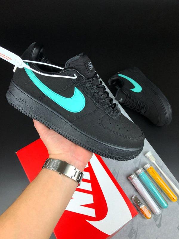 артикул 11997 чорні з бірюзовим ( в комплекті йдуть 3 пари шнурків, щітка, та свисток ) сезон: демісезонні виробник: В'єтнам модель: Nike Air Force 1 Low Tiffany & Co розміри: 36 37 38 39 40 41 42 43 44 45 матеріал: замш, підошва резина, прошиті