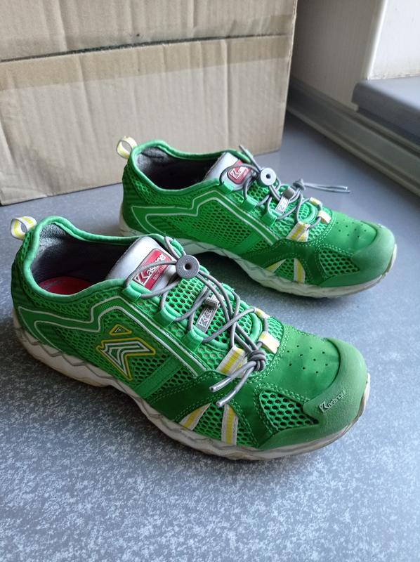 Кросівки Kastinger, оригінал відомого австрійського бренду спортивного взуття, дуже гарний стан, зелені з жовтим, білим і сріблястим, міцний трикотаж, дихаюча сітка, вологопоглинаючі ортопедичні устілки, шнурівка з регулятором, прорезинені носочки та задники, дуже красиво виглядають на нозі, дуже легкі м'які та зручні, прекрасно підійдуть для занять спортом туризмом та повсякденної носки, унісекс, розмір EU 39, US 7.5, UK 5.5, довжина устілки 25 см.