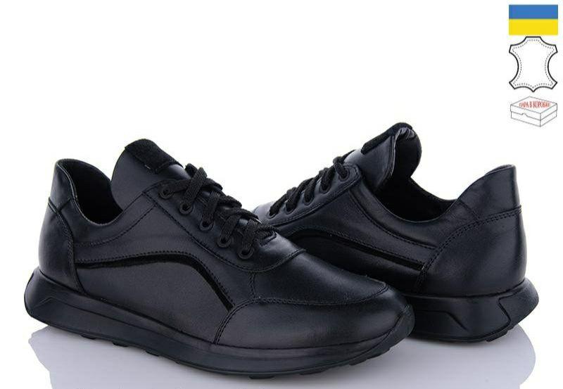 Мужские кроссовки выполнены из черной кожи. Подошва изготовлена из тполеуретана тошинная подошвы 2.0 см Производитель Украина 40-26,5 см 41-27, 1 см 42-27, 9 см 43-28,5 см 44-29, 2 см 45-29, 9 см
