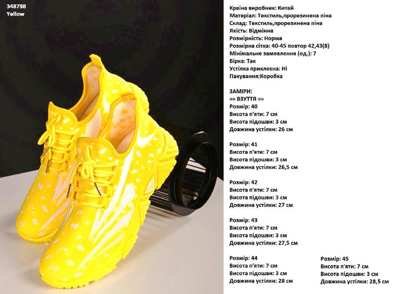 Літні Кросівки чоловічі текстильні, жовті 40 41 42 43 44 ( УНІСЕКС) Матеріал: Текстиль,прорезинена піна РОЗМІР: 40 41 42 43 44. ЗАМІРИ: == ВЗУТТЯ == Розмір: 40 Висота п'яти: 7 см Висота підошви: 3 см Довжина устілки: 26 см Розмір: 41 Висота п'яти: 7 см Висота підошви: 3 см Довжина устілки: 26,5 см Розмір: 42 Висота п'яти: 7 см Висота підошви: 3 см Довжина устілки: 27 см Розмір: 43 Висота п'яти: 7 см Висота підошви: 3 см Довжина устілки: 27,5 см Розмір: 44 Висота п'яти: 7 см Висота підошви: 3 см Довжина устілки: 28 см #Кросівки #чоловічікросівки #кросівкитекстильні #кросівкилітні #кросівкижовті #взуття #обувь