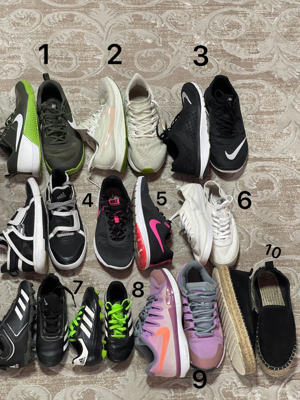 Кросівки Nike,adidas,різні як жіночі так і чоловічі у хорошому стані. 1. 44р-28см.ціна 1500грн(продано) 2. 43.р28см.Ціна 800 3. 44р-28см.ціна 1800грн(немає) 4. 38.-24см.ціна 300грн 5. 38,5-24,5см,ціна - 800грн 6.38р-24см,ціна 350грн 7. 31р-19см.ціна 300грн 8.28 р -17см.ціна 200грн 9. 38р-24,5см ціна 200грн 10. 38р-24,5см ціна 300грн