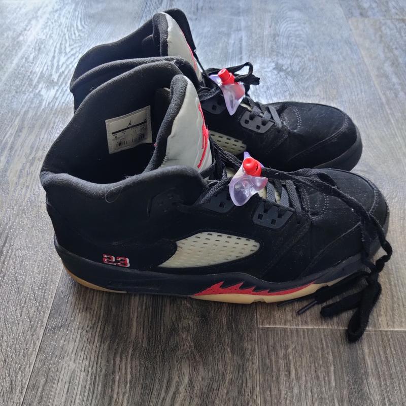 Обувь в отличном состоянии! Видимо на фото, что не порваны. Носилось осторожно, покупали новое в этом году. Характеристики: Дизайн: Jordan 5 имеет средневысокий верх из комбинации кожи и текстиля, что обеспечивает комфорт и поддержку. Культовой чертой AJ5 является сетчатая вставка по бокам кроссовок, которая добавляет дополнительную воздухопроницаемость. Подошва: Одна из самых заметных деталей Jordan 5 – это промежуточная подошва с технологией Nike Air, которая обеспечивает превосходную амортизацию и удобство при ходьбе. В пяточной зоне расположен видимый блок амортизации Air-Sole для дополнительной поддержки и комфорта. Детали: Дизайн Jordan 5 включает в себя много элементов, среди которых язычок с вышитым логотипом Jumpman, светоотражающие элементы на ящичке, а также петли для удобного обувания. Подошва с рифленым протектором: Еще одна характерная черта Jordan 5 - это подошва с выраженным рельефом, которая обеспечивает отличное сцепление с разными поверхностями и долговечность.
