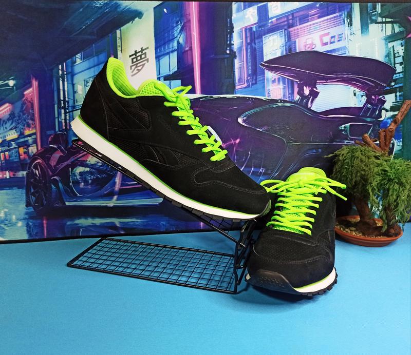 Reebok Classic Leather Tech v59399 Black/Neon Green/White По замеру 28,7см Модель старая, поэтому шрифт на ярлыке не такой как сейчас пишут и в интернете про неё ничего нет, но это оригинал (нашёл одно объявление на ebay - см. последние два фото) Исходя из того что линейку Classic Leather делают только из натуральной кожи - материал кроссовок нубук, но не гладкий, а немного бархатный Есть поверхностная потертость одного из задников, в целом отличное состояние Очень красивые матово-черные кроссовки с салатовыми и белыми акцентами Зелёный цвет в реальности не настолько насыщенный, как получился на моих фотографиях, но и далеко не такой бледный как на фото с ebay