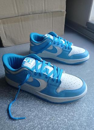 Кросівки Nike SB Dunk Low Pro, відмінний стан, блакитні з білим, високоякісна еко шкіра, класична шнурівка, оригінальні вологопоглинаючі ортопедичні устілки, прошита підошва, дуже красиво виглядають на нозі, дуже легкі м'які та зручні, прекрасно підійдуть для занять спортом та повсякденної носки, унісекс, розмір EU 40.5( по бірці 40), 8.5, UK 6.5, довжина устілки 25.5 см, повна довжина 26 см.