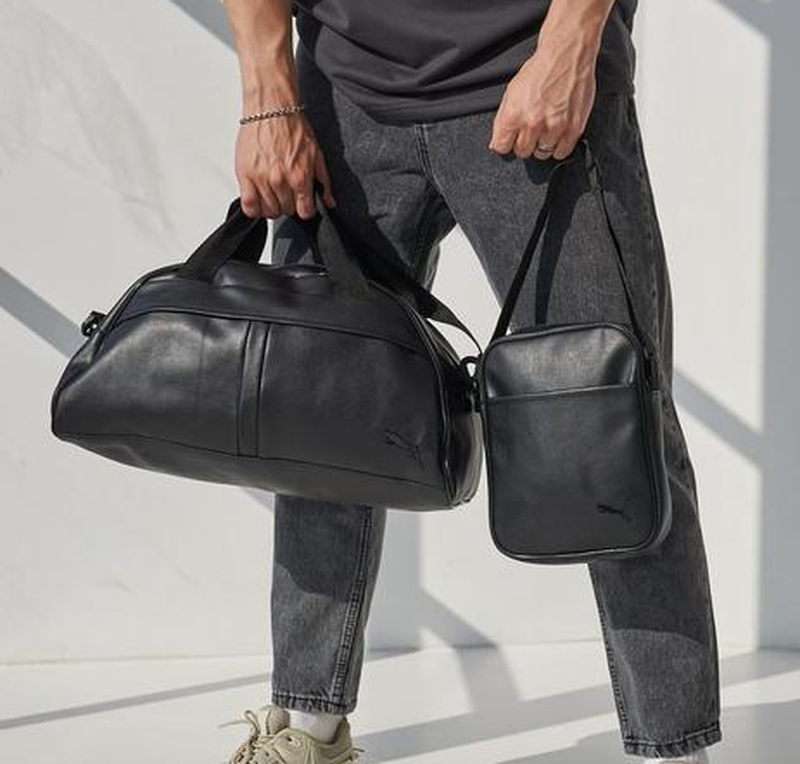 Комплект спортивная кожаная сумка + борсетка черная мужская puma