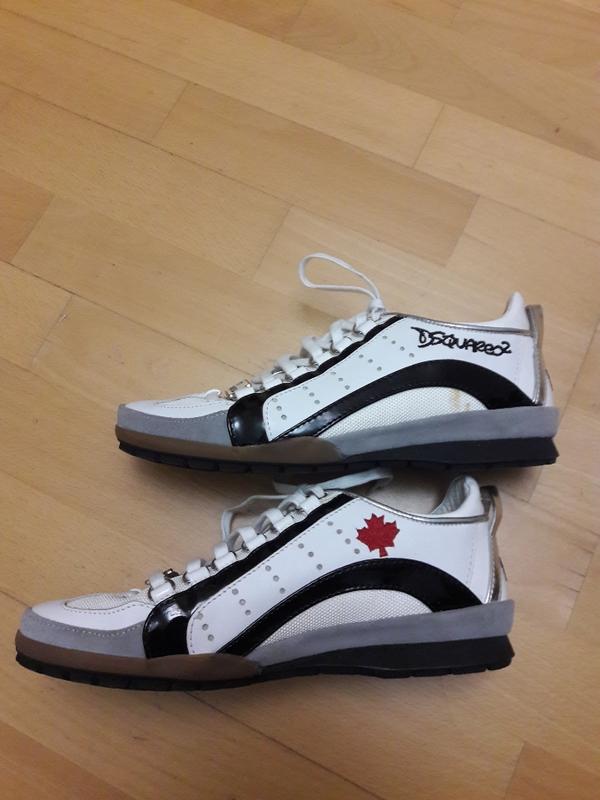 Шкіряні кросівки 39,5 розміру. Бренд Dsquared 2 ( Італія), оригінал. Вказаний розмір 40, трохи маломерят. Довжина устілки 26 див. Дефект - пляма на 1 кросівці ( див. фото). Виводити і прати не намагалася.